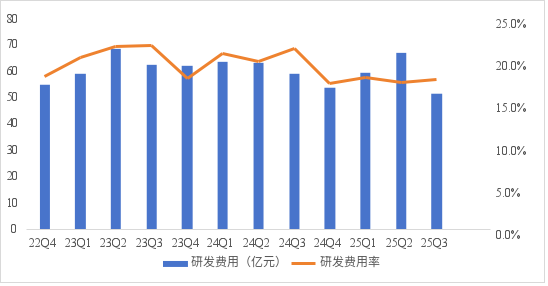 二是,在算力业务拉低整体毛利率的背景下,由于AI芯片、服务器、AI手机等新兴业务尚处于早期阶段,想要强化产品、抢占市场均面临高昂的研发投入和推广成本,这也进一步侵蚀了中兴通讯整体的盈利能力。25年Q3,公司的研发费用高达51.5亿元,研发费用率达到了18%。