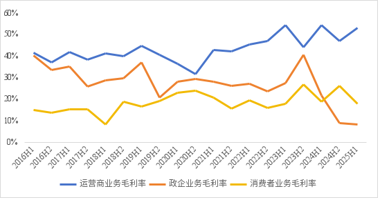 近两年,随着5G网络建设进入成熟期,三大运营商资本投资整体下降。根据运营商中报披露,25年H1电信、联通的资本开支同比下滑了27.5%和15.5%,下滑幅度远超24年年报的指引预期。在此影响下,中兴通讯核心的运营商业务持续承压,收入增速自24年陷入负增长,给整体营收带来了较大压力。