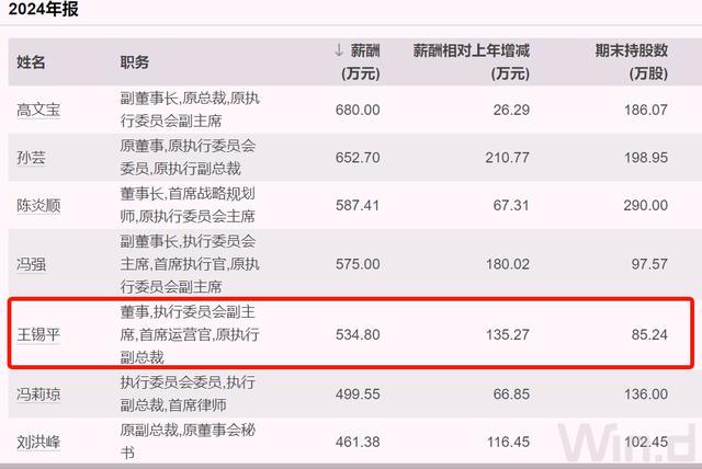 作为公司核心高层之一,王锡平2024年领取税前薪酬约535万元,比2023年增加135万元,位列第五;他还持有85.24万股股票,按照最新股价4.09元计算,价值大约350万元。
