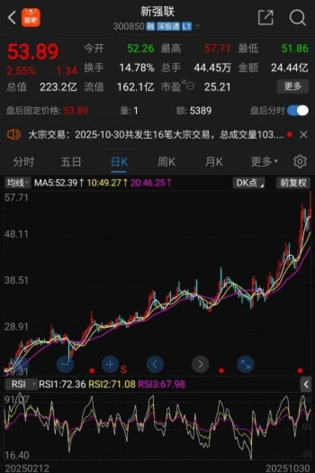 在股价方面,新强联的表现也非常突出,截至10月30日收盘为53.89元/股,本月涨幅约24%,其年度涨幅超180%。在此之前,新强联10月20日至24日股价连涨5日,区间涨幅近30%。