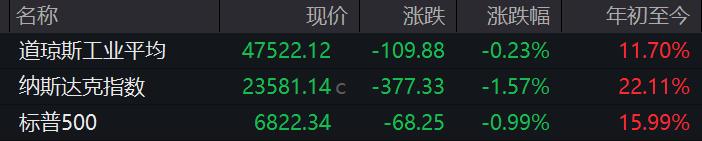 截至收盘,道指跌0.23%,报47522.12点;标普500指数跌0.99%,报6822.34点;纳指跌1.57%,报23581.14点。