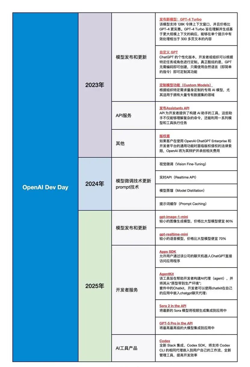 如果我们系统梳理OpenAI近三届开发者大会所发布的产品,其意图完善开发者生态的路径便愈发清晰。在2025年的大会上,重点发布了两款关键的开发者工具箱产品、旨在革新编程体验的AI编程产品Codex,以及服务于API的、性能更强大的高级模型。