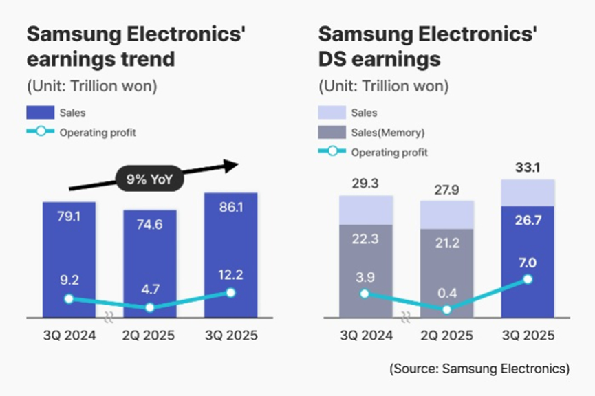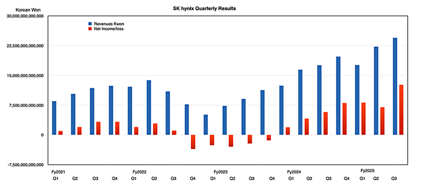 就韩国 SK 海力士而言,高带宽存储器 (HBM) 是一种高收入存储器;2025 年第三季度收入为 24.449 万亿韩元(171 亿美元),同比增长 39%,净利润为 12.598 万亿韩元(88 亿美元),同比增长 118.9%。