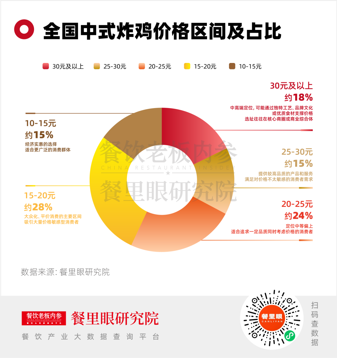 根据餐里眼研究院数据统计,全国中式炸鸡品牌价格带集中在15-25元,其中24元为中式炸鸡人均消费平均数。