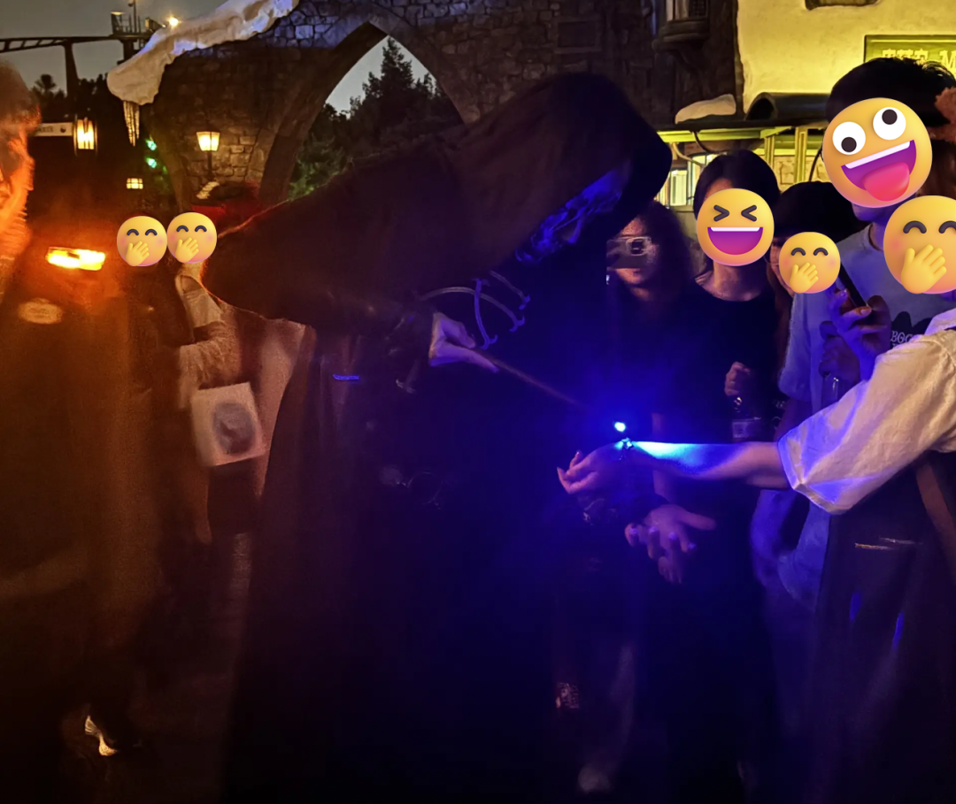 就可以看到奇幻的一幕,那些手搓黑魔法的“大坏蛋”在舞台上扭来扭去,下方是里三层外三层等着欣赏的麻瓜,像我等来晚的麻瓜只能通过高举的手机才能看到里面到底在干什么。演出结束,食死徒走到园区里和麻瓜互动,一堆堆人开始疯狂涌向他们。