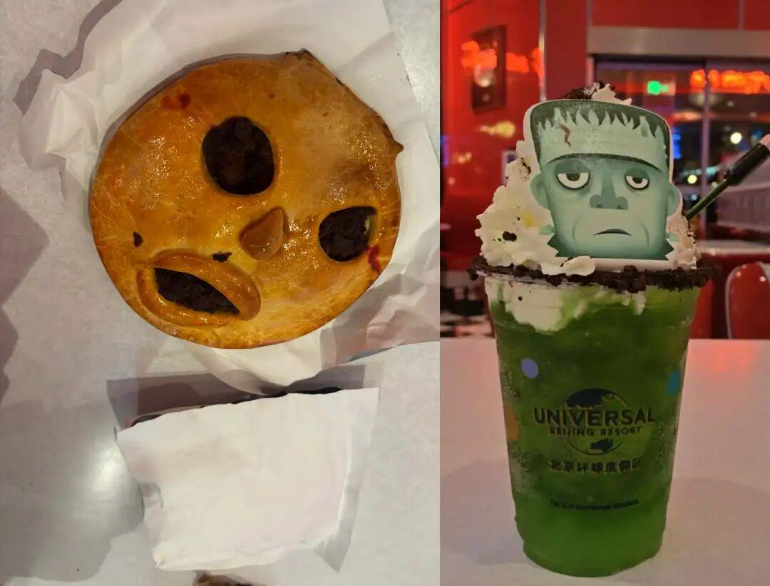 为了让园区的万圣节氛围更加浓烈,环球影城还会推出相应的节日美食,比如看起来又丑又萌“看久了灵魂会被吸走”的猪肉蘑菇派,以及园区内万圣节装置,梅尔斯餐厅门口“Drive in”的LED灯调成了“Die in”。