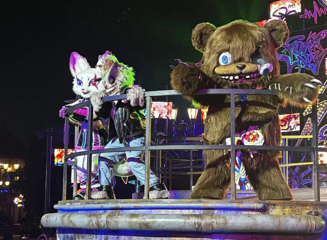 主打合家欢的迪士尼这些年也疯狂营造万圣节氛围,花车巡游变成了反派巡游,港迪今年甚至给11位反派举行了“恶人反转大街派对”。除此之外,类似环球影城的惊吓空间变成了夜间派对,夜晚降临,“永远守护你童心的地方”化身蹦迪现场,摇滚的、重金属的音乐伴随着氛围灯,像是看到长大的玲娜贝儿加班过度后的世界。