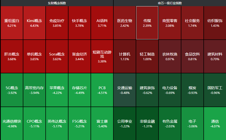 分行业来看,医药生物、传媒、商贸零售、社会服务、纺织服饰等行业领涨,通信、电子、有色金属等行业领跌。