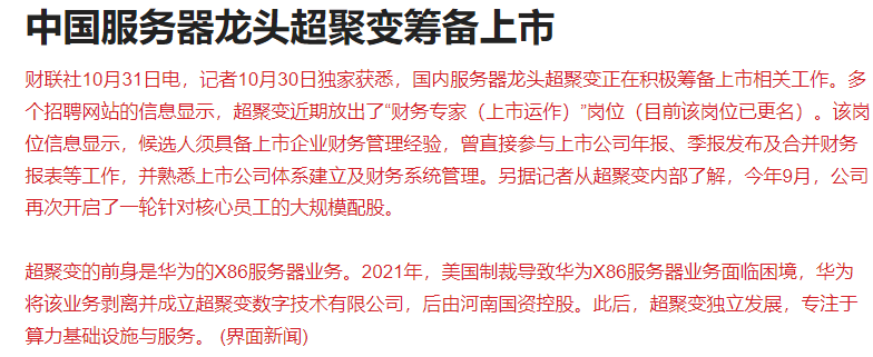 据报道,国内服务器龙头超聚变正在积极筹备上市相关工作。
