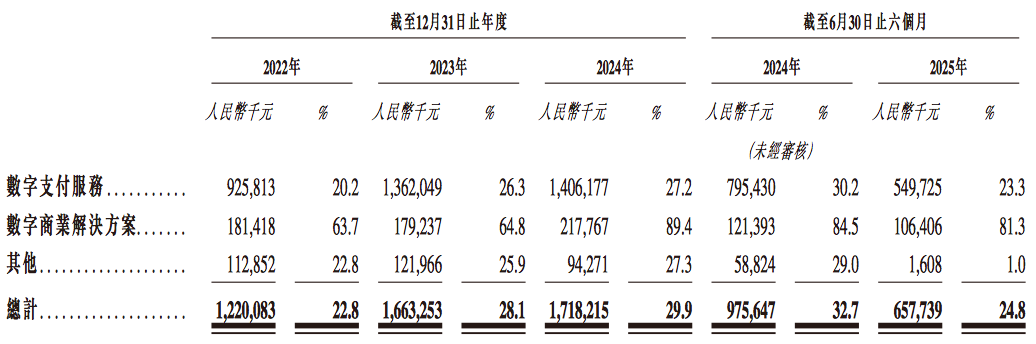 从收入结构和盈利能力来看,也存在明显的“错位”,贡献绝大部分营收的数字支付服务的毛利率远不如数字商业解决方案。2022-2024年,数字支付服务毛利率仅为20.2%、26.3%、27.2%,数字商业解决方案则高达63.7%、64.8%、89.4%。