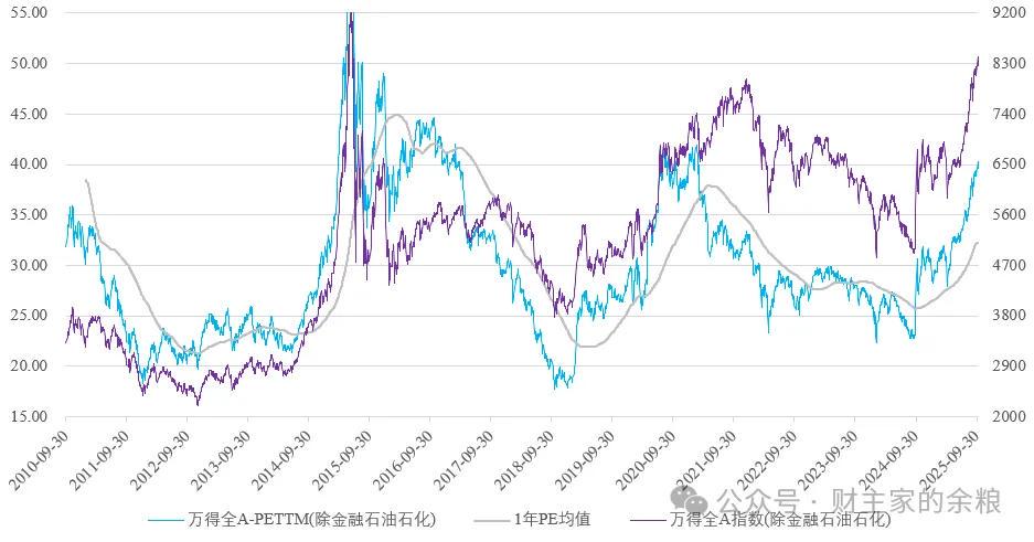 根据这张图,剔除金融石油石化之后的全A指数,当前估值其实已经超过了2021年年中时刻,接近2021年初和2020年7月份高点了,正向着2015年的估值高点前进。