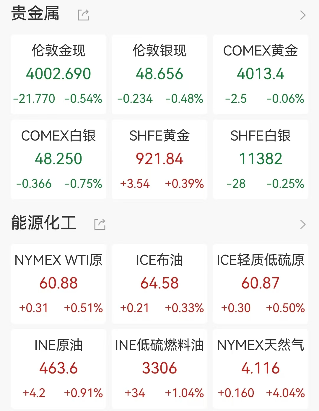 贵金属方面,周五(10月31日)纽约尾盘,现货黄金跌0.51%,报4004.02美元/盎司,10月份累计上涨3.74%,10月20日曾涨至4381.52美元创历史新高。COMEX黄金期货涨0.06%,报4018.50美元/盎司。现货白银跌0.54%,报48.6651美元/盎司。