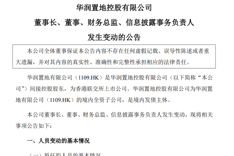 10月31日,华润置地的境内全资子公司华润置地控股有限公司(简称“置地控股”)发布人事变动的公告。