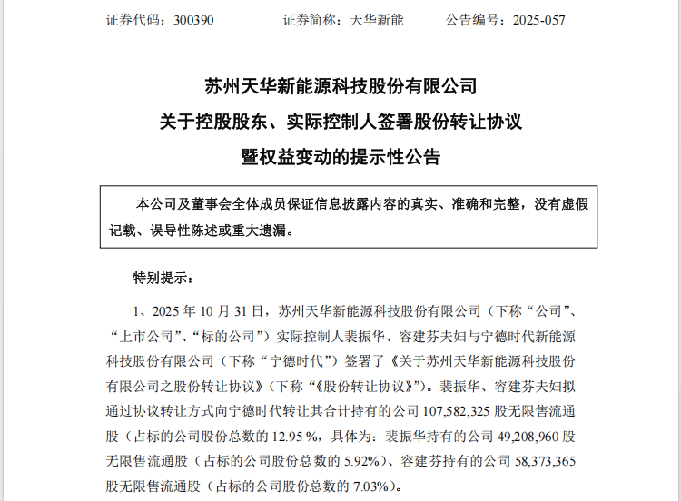 10月31日,裴振华、容建芬与宁德时代签署的《关于苏州天华新能源科技股份有限公司之股份转让协议》显示,裴振华、容建芬拟通过协议转让的方式,向宁德时代分别转让天华新能5.92%、7.03%的股份。