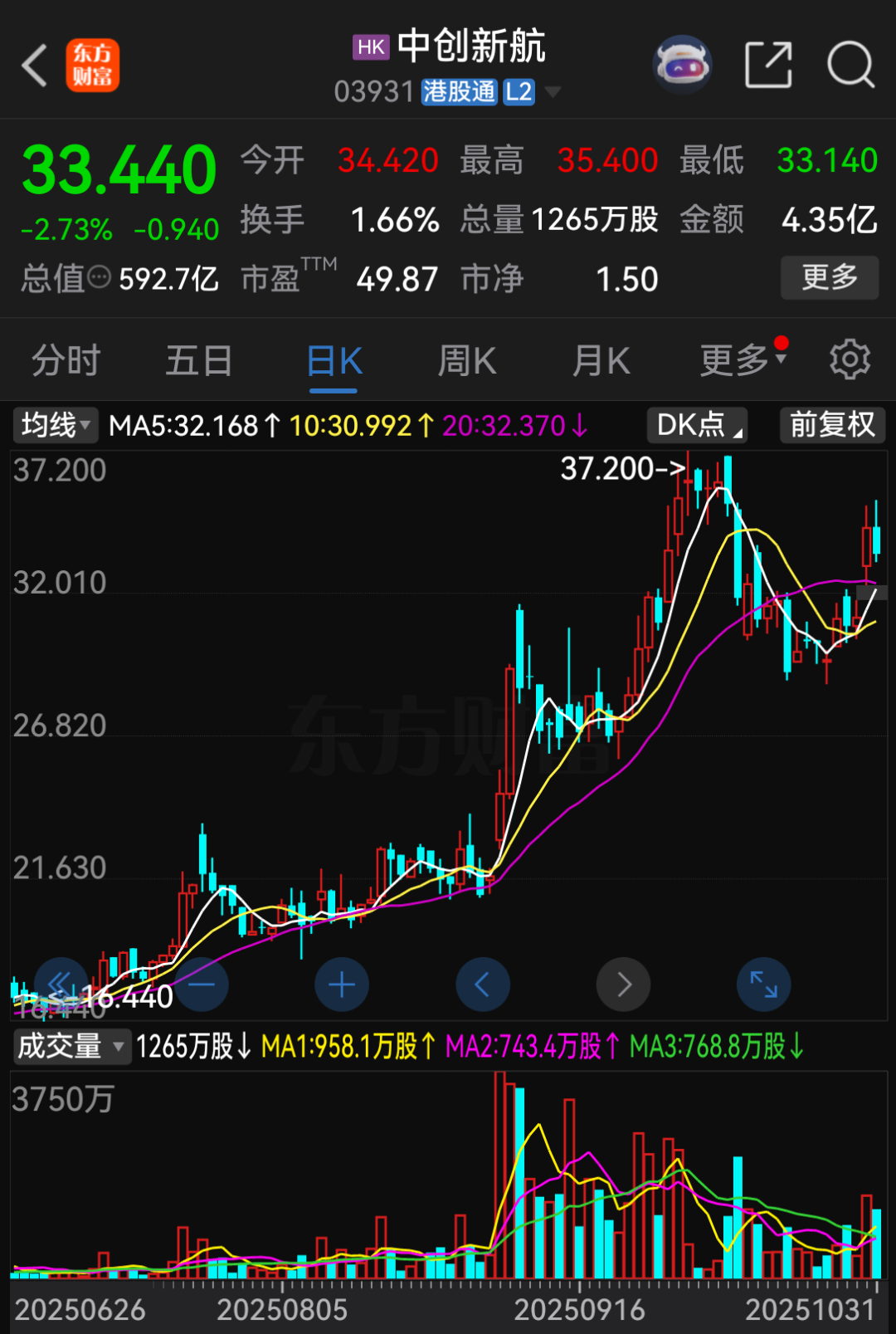 截至10月31日收盘,中创新航港股股价报33.44港元/股,跌幅达2.73%,总市值为592.7亿港元。