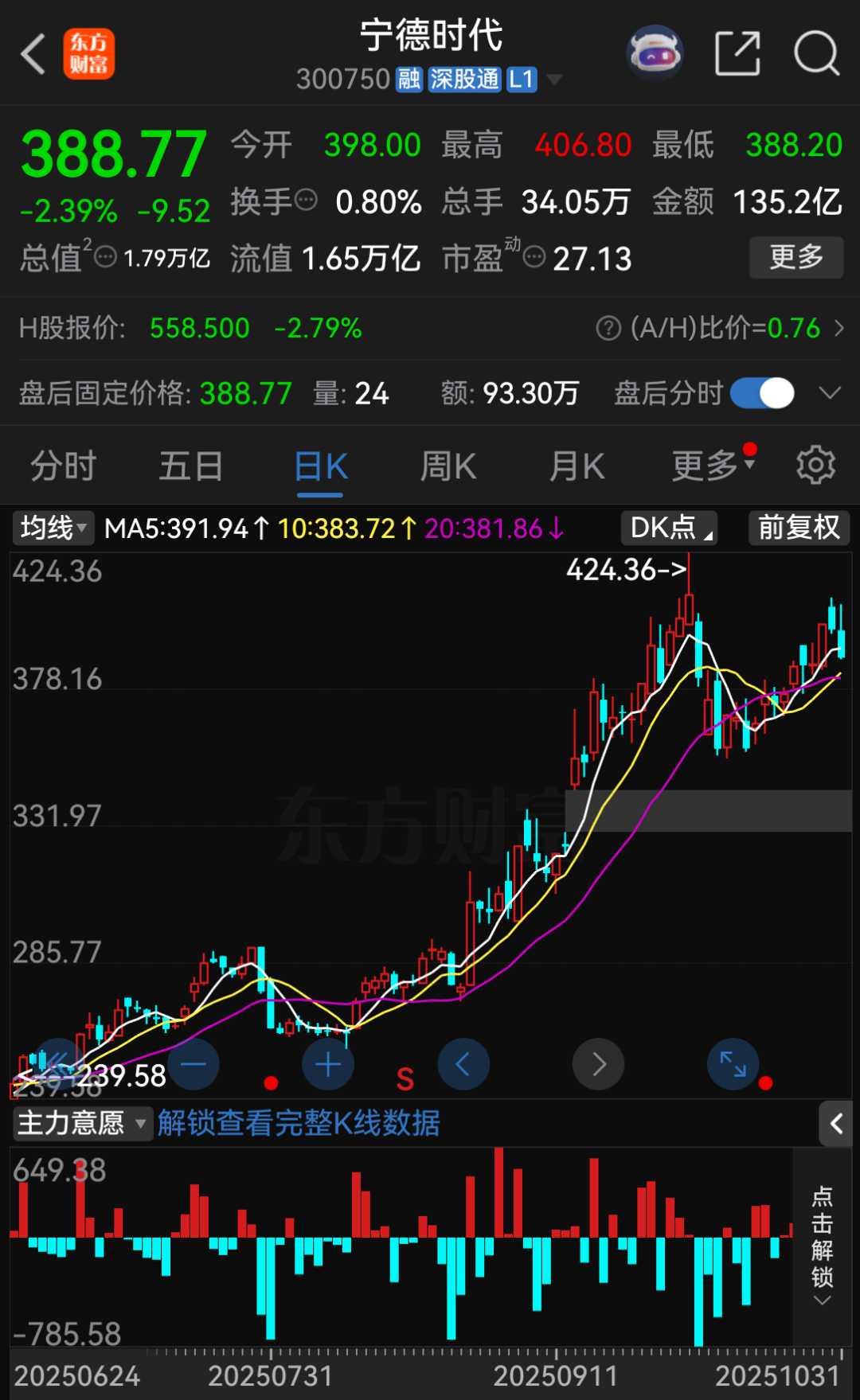 截至10月31日收盘,宁德时代A股股价报388.77元/股,跌幅达2.39%,总市值为1.79万亿元。