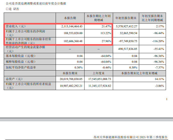 2025年第三季度,天华新能的营业收入同比增长21.47%至21.13亿元,归母净利润同比增长113.22%至1.89亿元。
