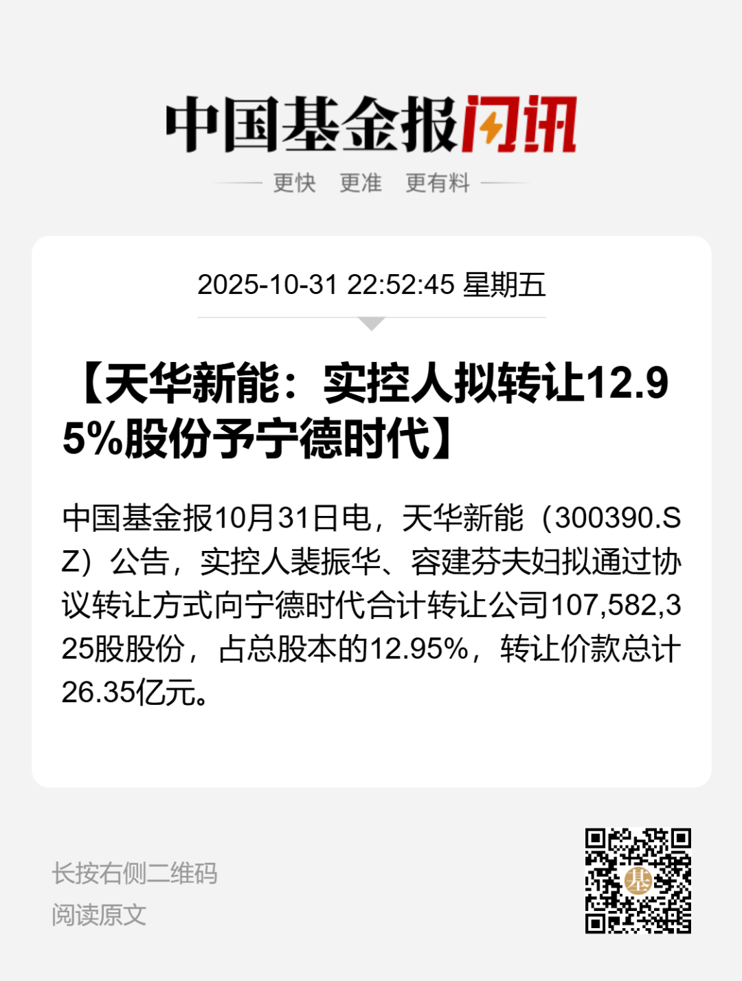 10月31日晚间,天华新能发布公告称,公司实控人裴振华、容建芬夫妇拟通过协议转让方式,向宁德时代合计转让所持12.95%的公司股份,转让价款合计达26.35亿元。