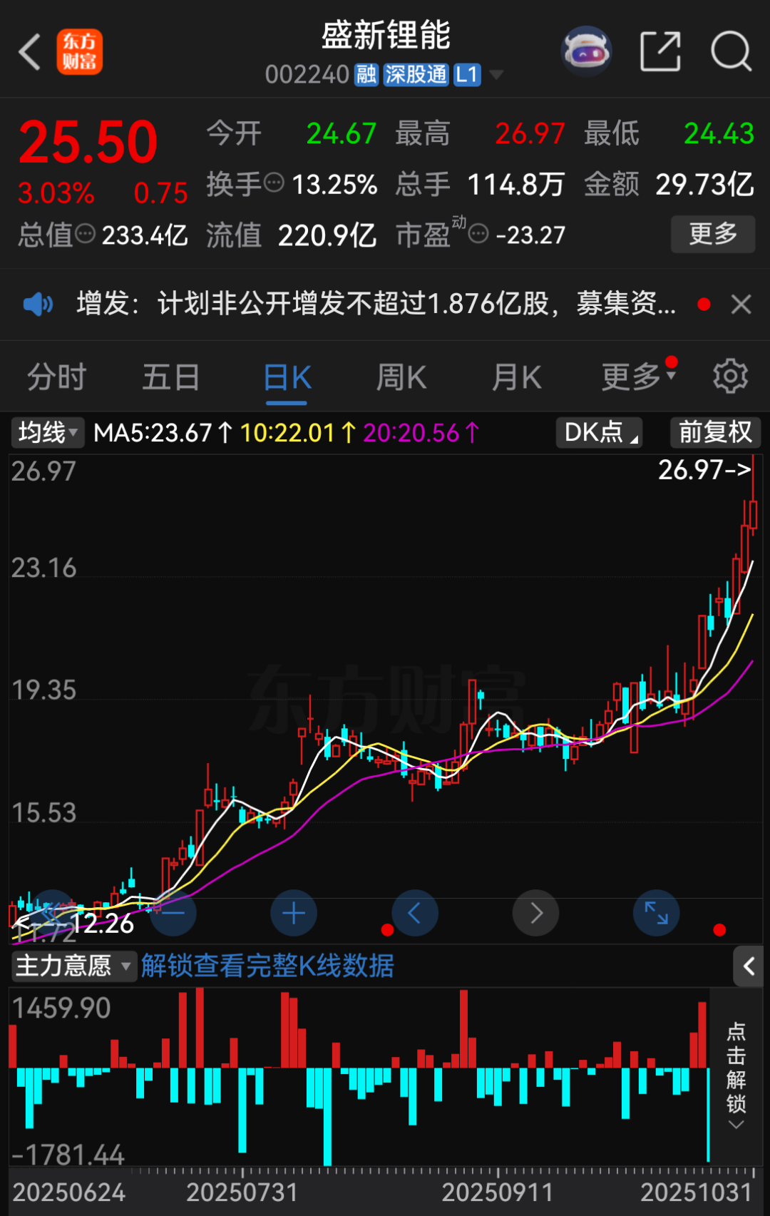 截至10月31日收盘,盛新锂能股价报25.50元/股,涨幅达3.03%,总市值为233.4亿元。