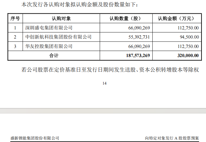 具体来看,盛新锂能拟向其控股股东深圳盛屯集团有限公司,以及中创新航、华友控股集团发行不超过1.88亿股股份(含),发行股份的价格为17.06元/股,预计募资总额不超过32亿元,扣除发行费用后拟用于补充流动资金及偿还债务。