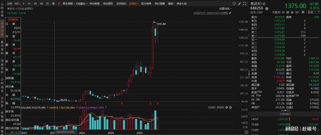 2022年3月梁军离职时,寒武纪的股价不过66.02元,现在高达1375元,涨了20多倍。按照寒武纪现在的市值,梁军间接持有的寒武纪1150万股,高达158.44亿元!