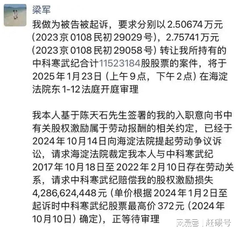 今年1月,网传梁军在个人朋友圈发布消息称,其遭寒武纪公司起诉,要求以约5万元的金额转让所持有的超1150 万股相关股票。