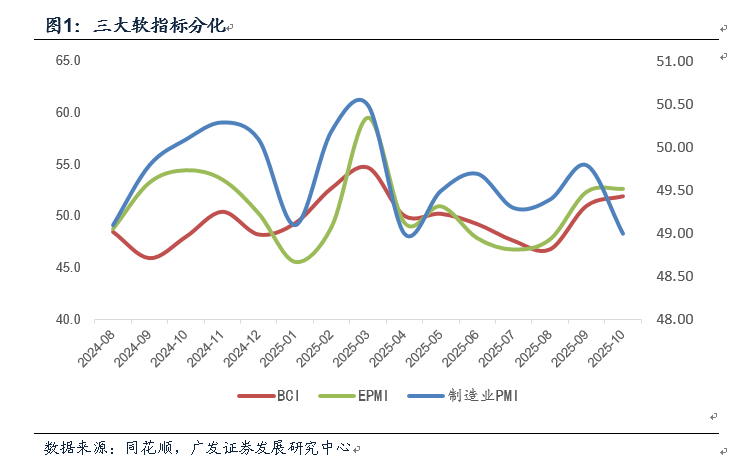 10月PMI数据整体略低于预期:制造业PMI为49.0,环比下降0.8个点。尽管10月由于工作日减少,历史上多数情形下环比下降,但此次降幅要略大于季节性均值,2017-2023年下行年份的均值为-0.6。两个价格指标在前期上行后,10月连续第二个月回踩。前期出来的10月EPMI、BCI数据均相对偏强,三大软指标分化,短期经济再次缺少一致性信号。