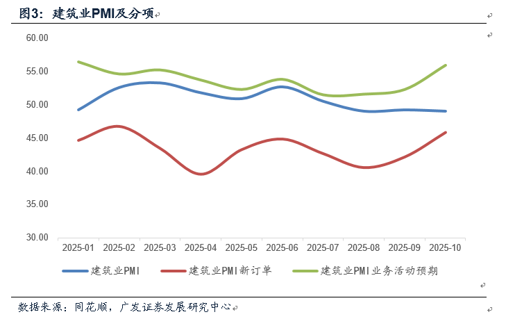 10月建筑业PMI为49.1,低于前值的49.3;新订单为45.9,高于前值的42.2;业务活动期指数为56.0,高于前值的52.4。