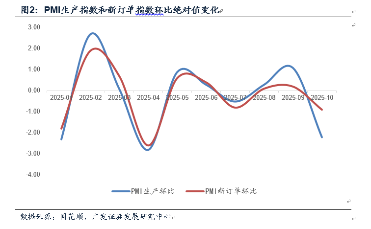 第二,从分项数据看,生产端的收缩是主要特征,是数据边际变化的源头。生产、采购、新订单、在手订单指数环比分别下降2.2、2.6、0.9和0.7个点。前期生产指数一直较高,9月达51.9,10月骤然收缩,我们推测可能和月内关税、航运环境存在较大不确定性的背景下企业的避险预期有关,即企业主动审慎生产来规避外部环境风险。统计局也指出“受十一假期前部分需求提前释放及国际环境更趋复杂等因素影响”。