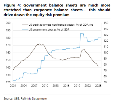 瑞银认为,这种“政府弱、企业强”的格局,可能导致投资者为了规避主权信用风险而将资金从名义资产(如债券)转向实际资产(如股票),从而降低了对股权风险溢价(ERP)的要求,为更高的股票估值提供了支撑。