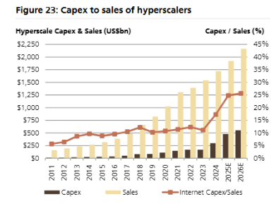 债务融资过度的风险也较低。尽管头部11家超大规模数据中心(hyperscalers)的资本开支/销售额比例已接近2000年电信运营商的水平,但融资方式截然不同,如今的科技巨头主要依靠自身强大的现金流而非债务来支持投资。