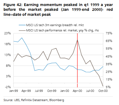 在互联网泡沫中,盈利动能在市场见顶前约一年就已达到顶峰。而当前,科技股的盈利修正势头依然优于市场表现。(1999年盈利势头第一季度达到顶峰,红线代表市场峰值的日期)