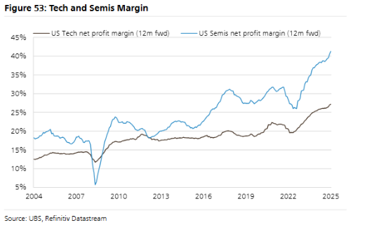 不过,瑞银也提醒,真正的泡沫可能潜藏在科技行业,尤其是半导体行业的高利润率中,随着资本密集度上升和竞争加剧,高利润率未来可能面临压力。