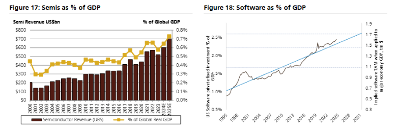 而对于本轮AI核心的半导体,瑞银估算,如果到2030年半导体行业支出占全球GDP的1.3%(从目前的约0.7%提升),那么当前的估值就是合理的。