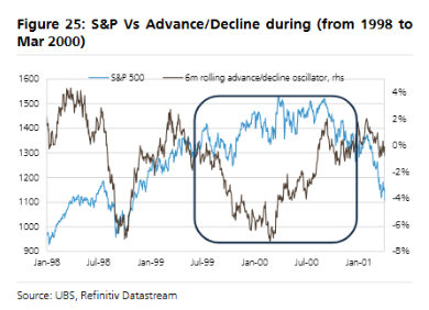 (1998年至2000年3月期间,标普指数与股票上涨/下跌数量的对比走势)