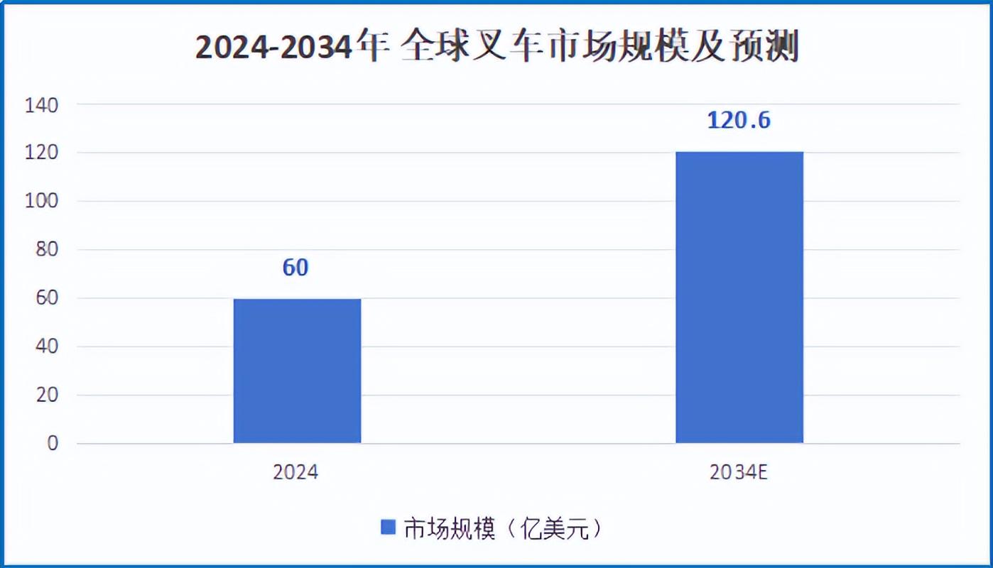 数据最能说话。2024年全球叉车市场规模约为60亿美元,预计到2034年将突破120.6亿美元,2024-2034年复合年增长率为6%。