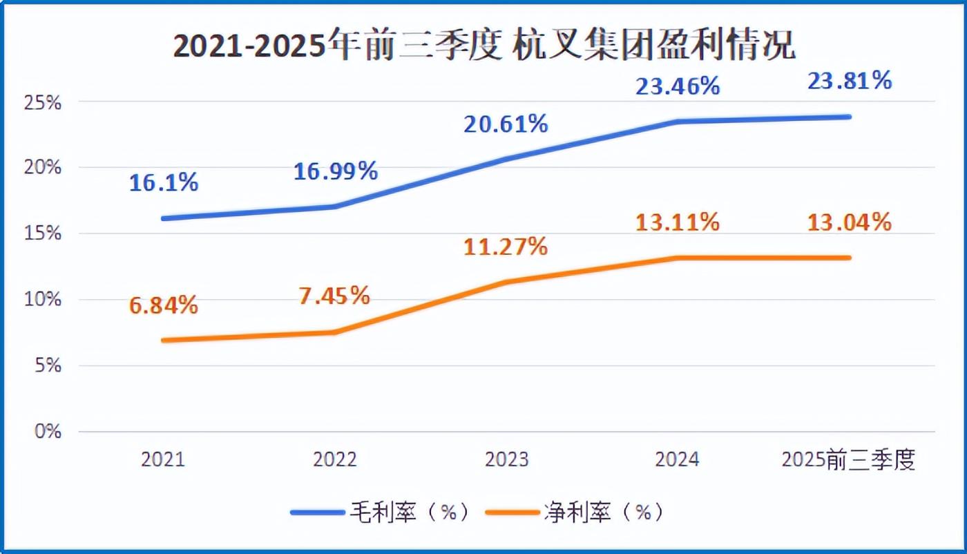 数据显示,2021-2025年前三季度,公司的毛利率从16.1%提高到23.81%,提高了7个多百分点,无疑是推动杭叉集团净利率增长的关键因素。