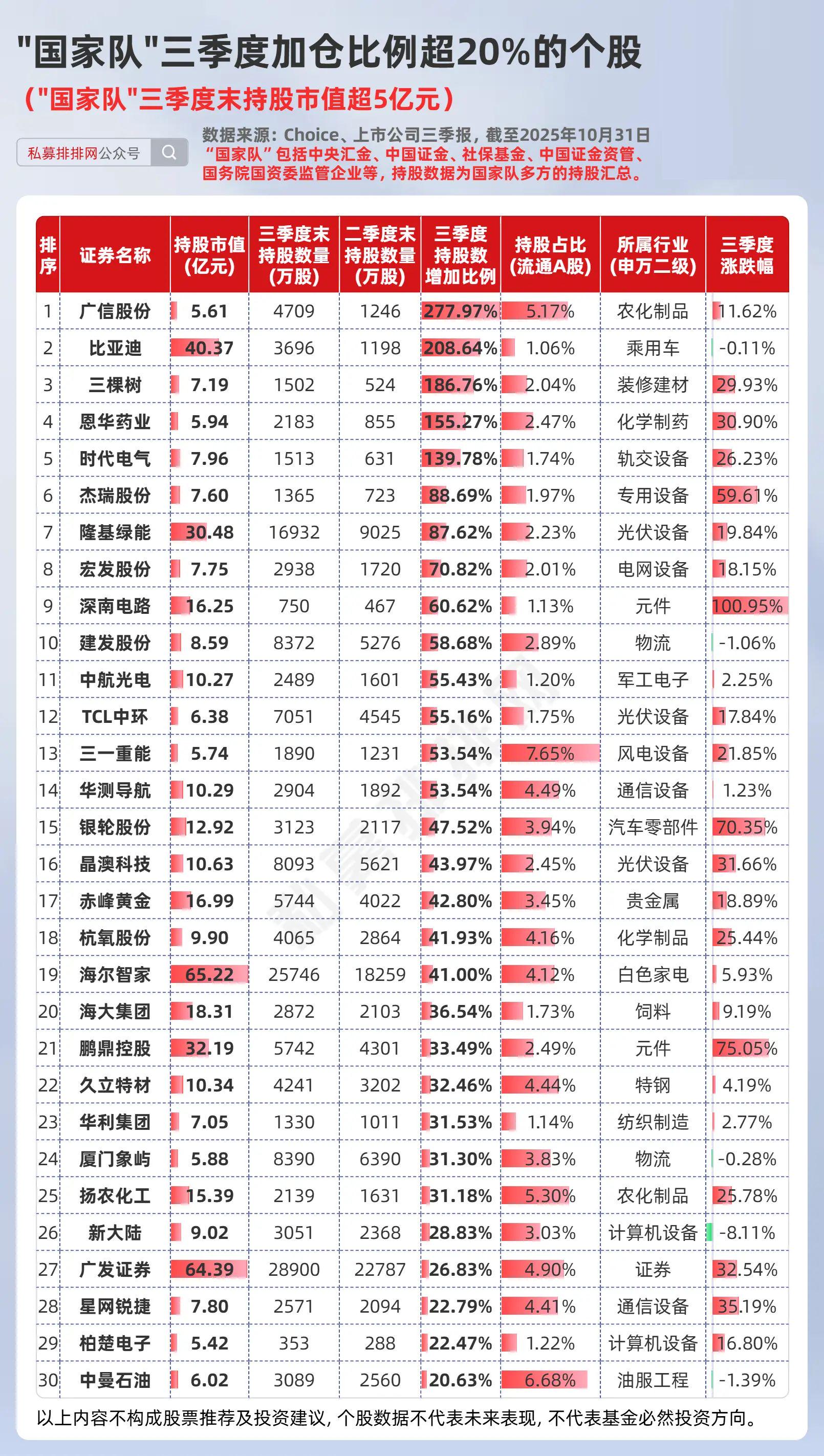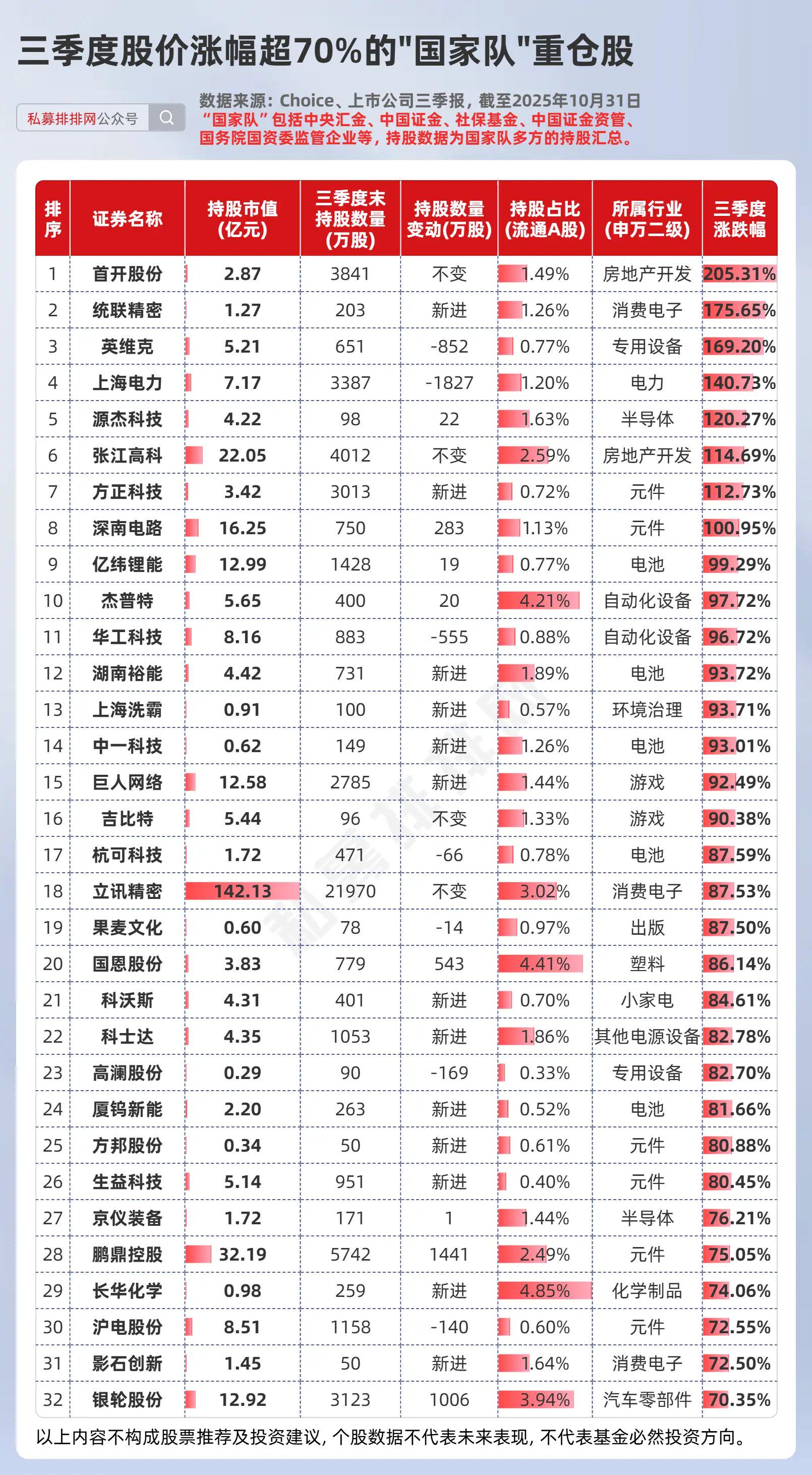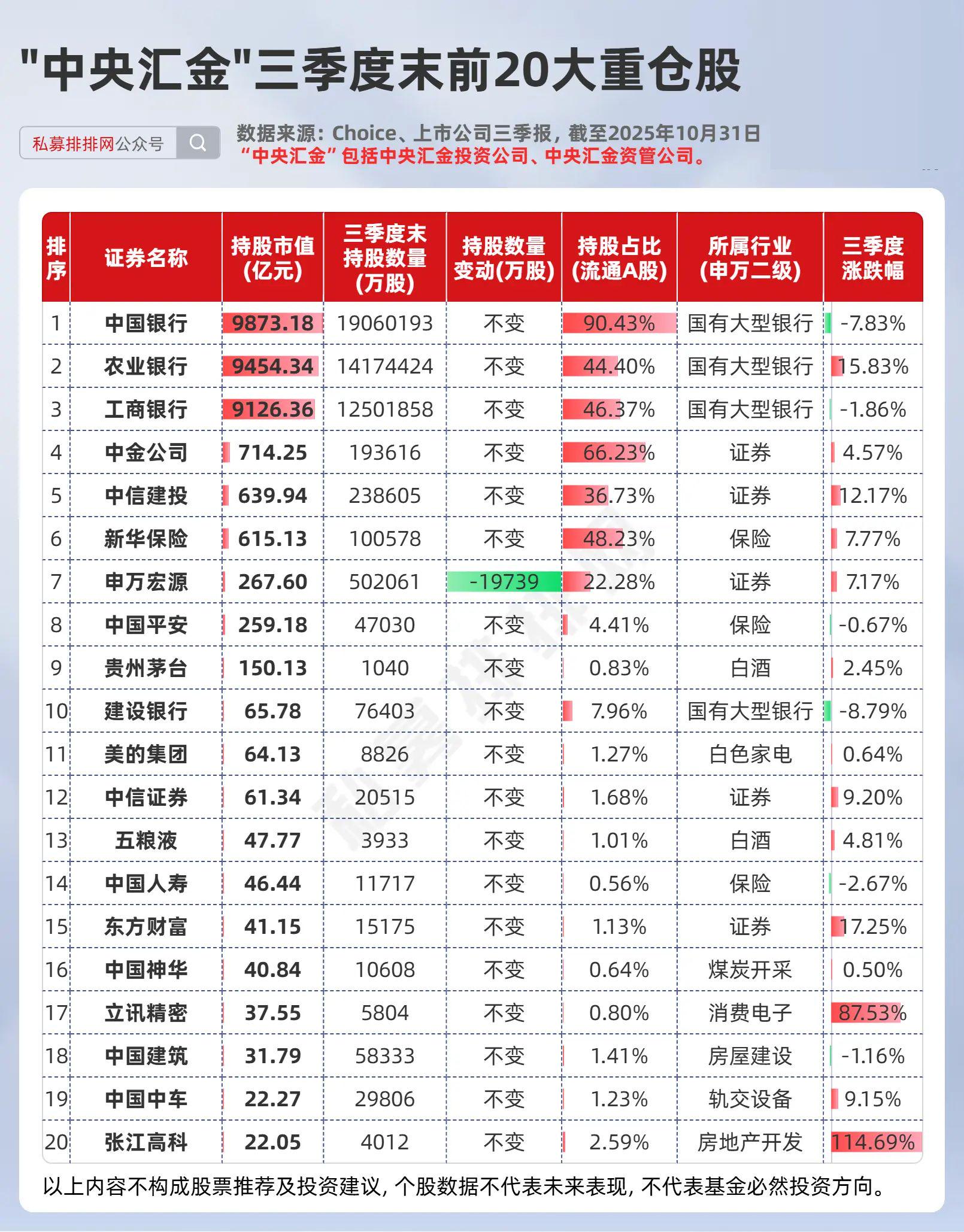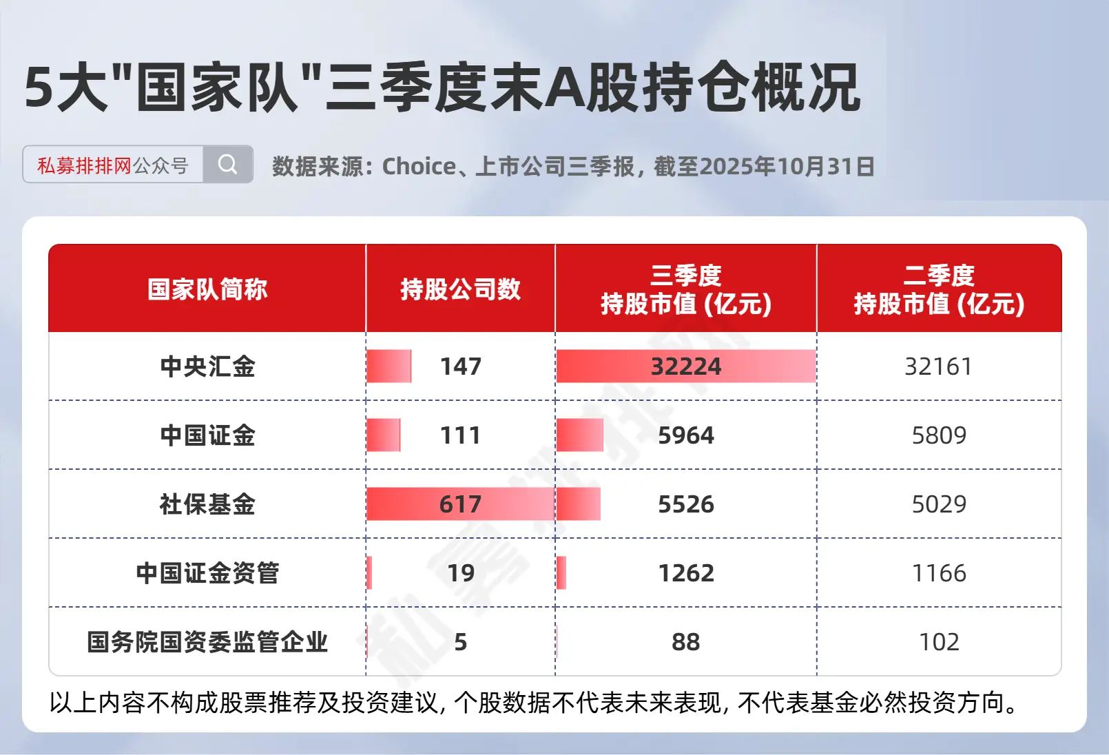 截至10月31日,A股公司的2025年三季报已经落下帷幕。随着三季报的披露,A股“国家队”的最新持仓也随之浮出水面。