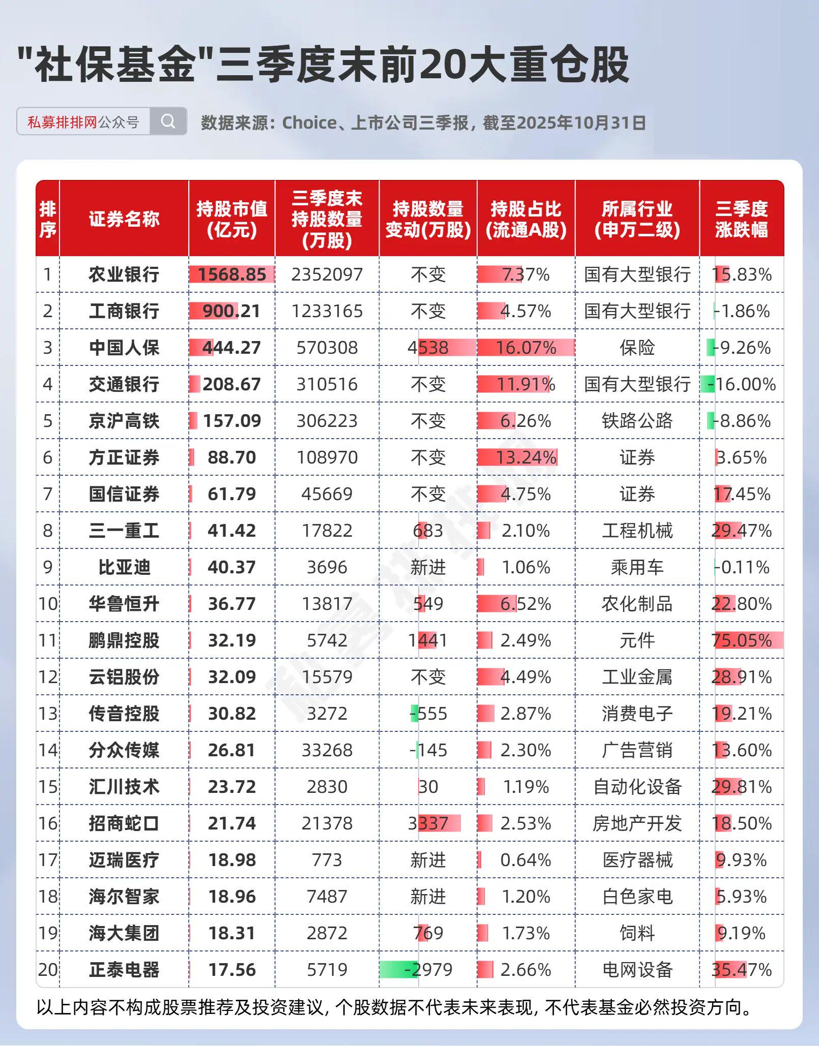相比中央汇金的市场“稳定器”作用,社保基金承担着为国民理财的使命。2025年三季度末,社保基金前20大重仓股中,银行和非银金融行业各占3家;持股动向上,三季度加仓和持股不变公司各占7家,新进和减仓公司各占3家。社保基金的前3大重仓股分别是:农业银行、工商银行、中国人保。