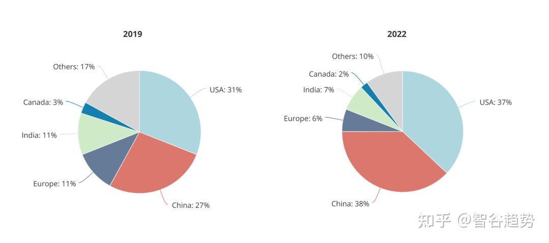 美国机构顶尖人工智能研究人员(前20%)的主要原籍国