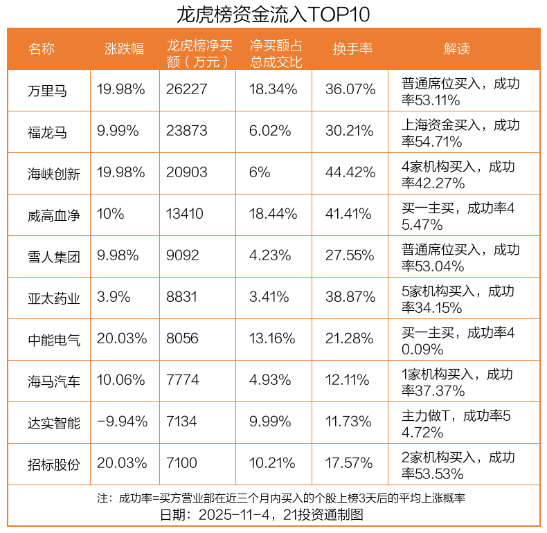 11月4日,上证指数下跌0.41%,深证成指下跌1.71%,创业板指下跌1.96%。盘后龙虎榜数据显示,共有46只个股因当日异动登上龙虎榜,资金净流入最多的是万里马(300591.SZ),达2.62亿元。