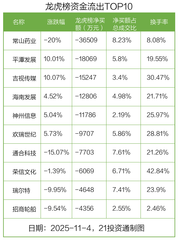 而龙虎榜中资金净流出最多的是常山药业(300255.SZ),被净卖出为3.65亿元,占总成交金额的8.23%。常山药业收盘下跌20%,换手率为8.08%。