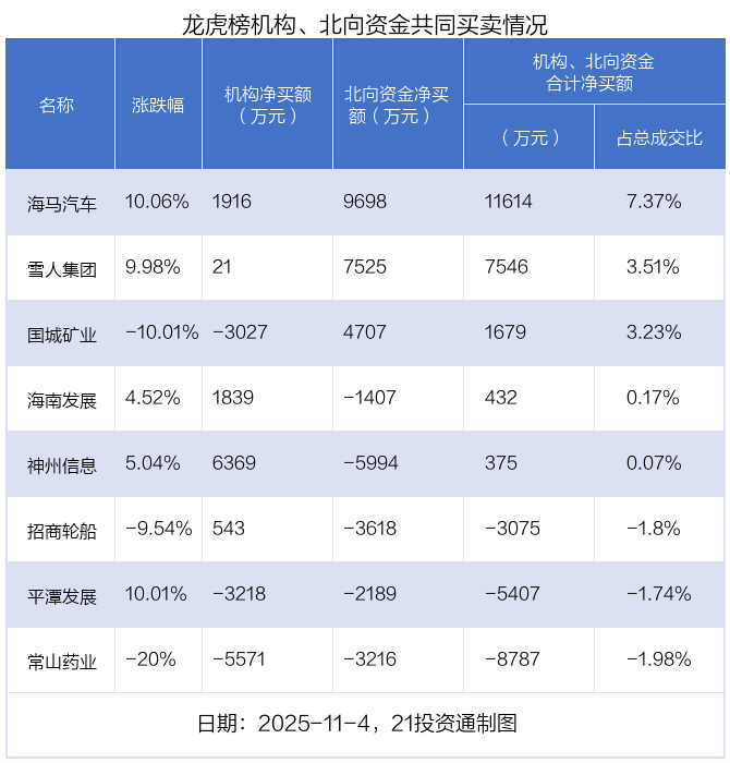 值得注意的是,机构和北向资金共同净买入了海马汽车、雪人集团等2股;共同净卖出了平潭发展、常山药业等2股;在国城矿业,海南发展,招商轮船,神州信息上出现分歧,机构净卖出国城矿业3027.38万元,北向资金净买入4706.76万元;机构净买入海南发展1839.08万元,北向资金净卖出1407.42万元;机构净买入招商轮船543.44万元,北向资金净卖出3618.3万元;机构净买入神州信息6368.91万元,北向资金净卖出5993.97万元。