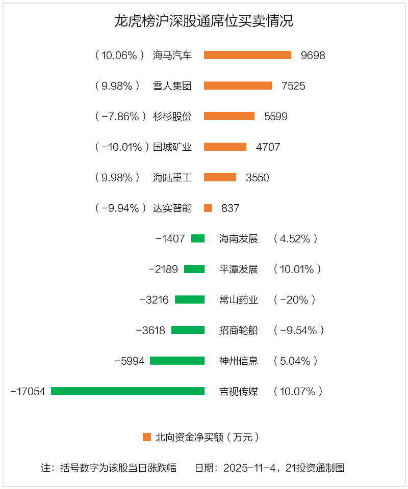 北向资金净买入金额最多的是海马汽车(000572.SZ),净买入9697.8万元,占总成交金额的6.15%。净卖出金额最多的是吉视传媒(601929.SH),为1.71亿元,占总成交金额的3.81%,当日收盘上涨10.07%,换手率为30.47%。