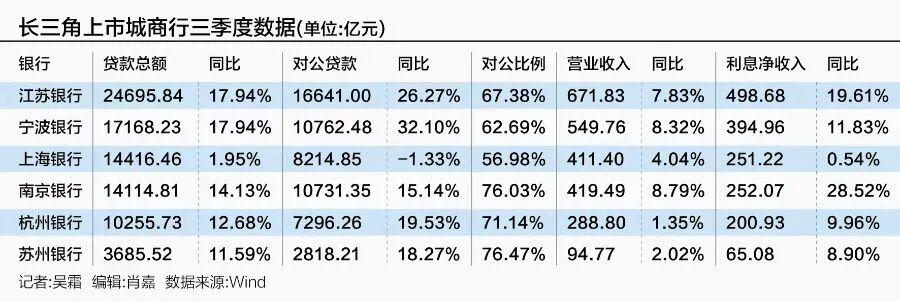 今年前三季度贷款总额增速超过10%的包括江苏银行17.94%、宁波银行17.94%、南京银行14.13%、杭州银行12.68%、苏州银行11.59%。