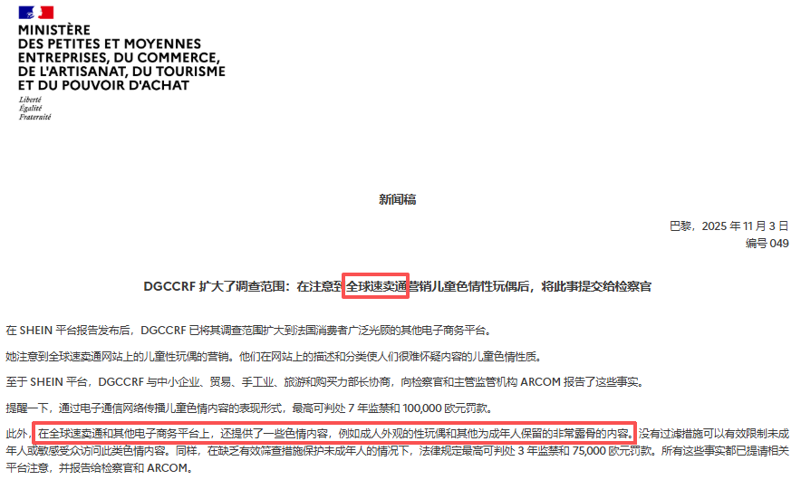 近 期, 法国消保 与反欺诈总局(DGCCRF)发文,已就希音在网上销售带有“儿童色情特征”的性玩偶一事,向司法部门举报。