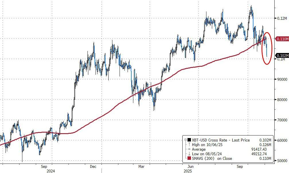 周二,比特币价格加速下挫,自6月以来首次跌破10万美元大关,一度下探至99932美元附近,并跌穿200日移动均线,创下年内第二大单日跌幅。市值排名第二的以太坊同样暴跌超10%,跌至3225美元附近。