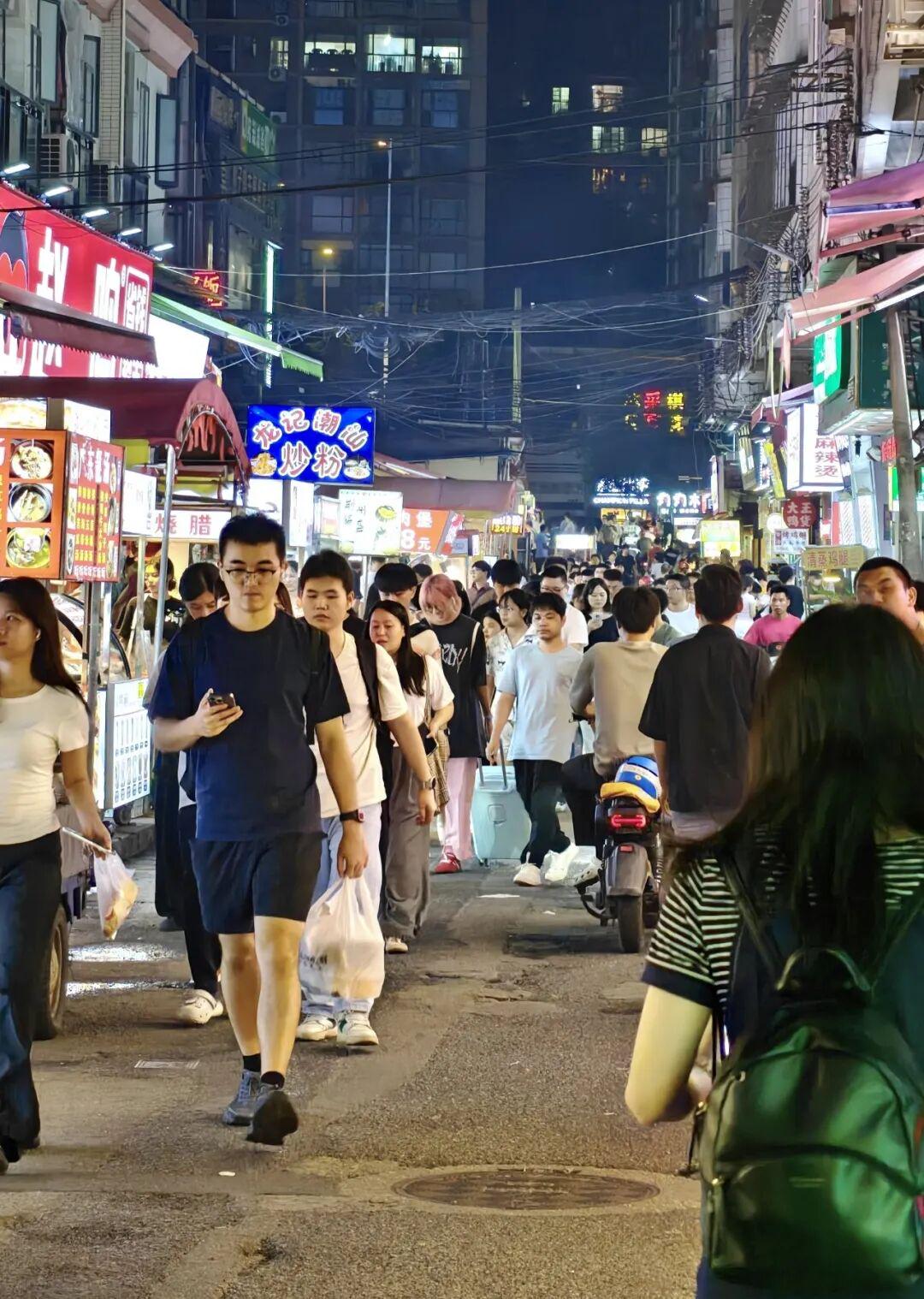 傍晚还有各种各样的小吃摊。炒粉、炒面、凉菜、螺蛳粉、烧烤、糖水、麻辣烫、钵钵鸡,南来北往的人都能找到他的家乡味……方圆几百里,你能吃遍全中国。