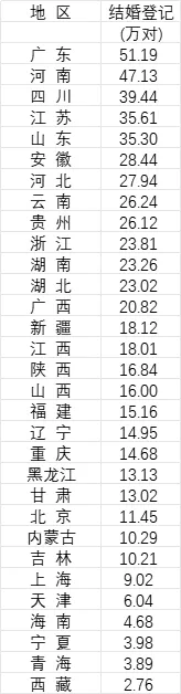 光看51.29万对这个数字可能没什么感觉,但对比一下同样经济发达的江苏,结婚登记却只有35.61万对,差距一下子就出来了。