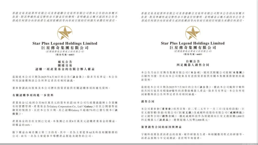 连续两日,巨星传奇集团有限公司(以下简称“巨星传奇”)动作不断。继11月3日通过产业基金认购韩国知名艺人权志龙经纪公司Galaxy不超过7%的已发行股本后,11月4日,巨星传奇再发公告称,全资附属公司巨星文创智权(香港)有限公司与威刚科技股份有限公司(以下简称“威刚科技”)订立销售合同,威刚科技作为经销商,向巨星文创采购1000台四足机器人,宇树科技将负责该产品的技术、硬件研发及生产和相关应用程式的研发等。